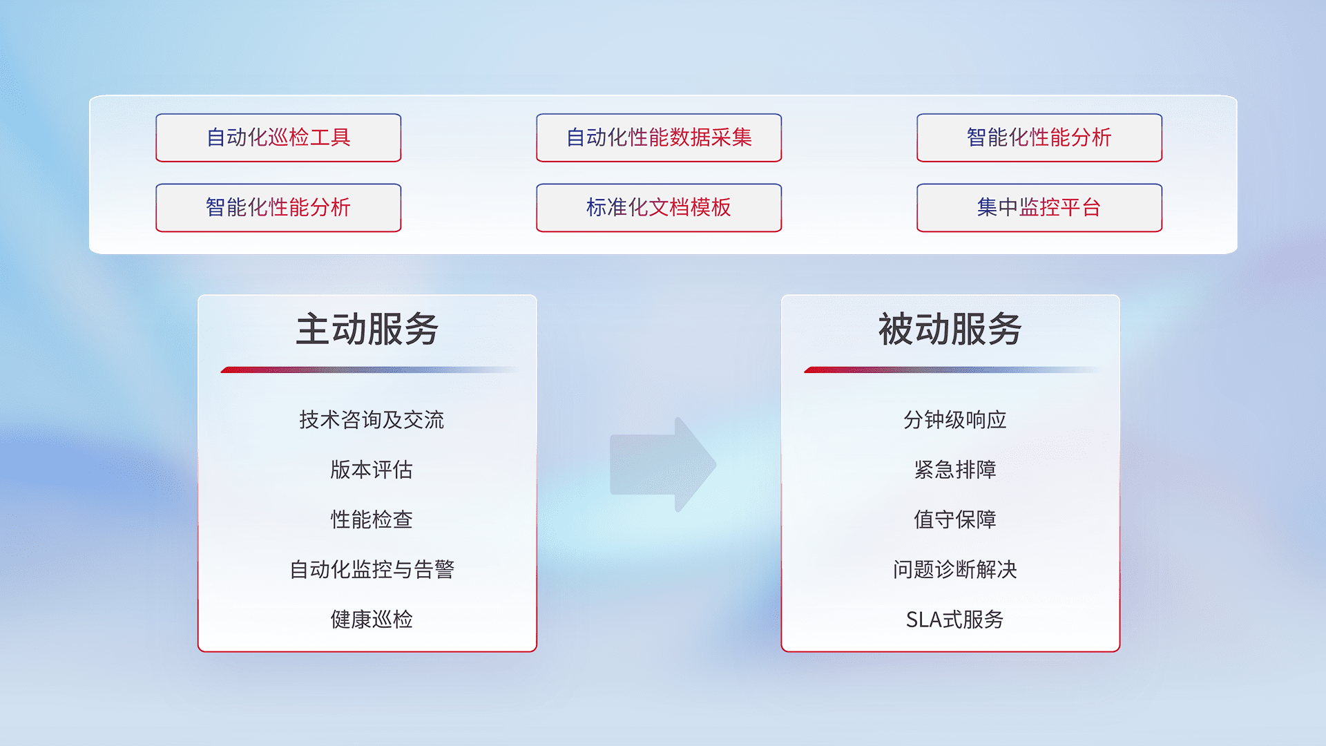 智能化工具和标准化文档,,,,保障服务质量,,,,提供主动服务(包含技术咨询、、、、版本评估、、、性能检查、、、、自动化监控与告警、、、健康巡检)和被动服务包含(分钟级响应、、紧急排障、、、、值守保障、、、、问题诊断解决、、SLA服务)。。。